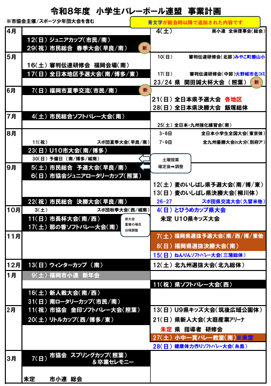 TOPページ 福岡市小学生バレーボール連盟のオフィシャルサイトです。 Topics ★主な予定です★ 新着情報 2026年4月1日 NEW! 2026年4月12日 ジュニアカップ 2026年2月13日 2/23 (月)祝日 スプリングカップ 2026年2月4日 2/11 金印ソフトの組合せ、注意事項、コートイメージをアップしました。 2026年2月3日 2/15 令和7年度 『健康体力つくりフェアー”2026”』 ソフトバレーボール大会 2026年1月29日 1/31(土) 南ロータリーカップ(早良体/南体)大会 入館時間などにつきまして 2026年1月17日 2/15 2025年度 「小中連携強化事業」小学生バレーボール教室 2026年1月17日 2/23 (月)祝日 卒業セレモニー 光輝賞の名簿提出 2026年1月13日 1/18(Bパート)第2回 城東カップ新人戦大会 1/25(Aパート) 第2回 城東カップ新人戦大会の組合せと1/18(Bパート)東体育館の駐車場についてアップいたしました。 2026年1月13日 2/11 第29回福岡市金印ライオンズカップソフトバレーボール大会 2025年12月28日 1/31(土) 南ロータリーカップ(早良体/南体)大会申込&御礼メッセージ作成のお願い ◆過去の投稿はこちら◆